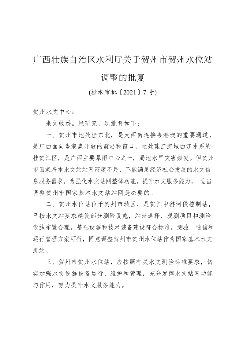 / 广西壮族自治区水利厅关于贺州市贺州水文站调整的批复