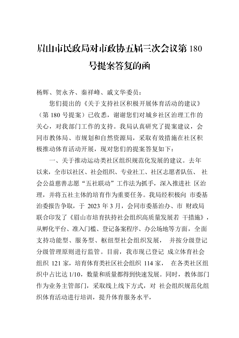 / 眉山市民政局对市政协五届三次会议第180号提案答复的函