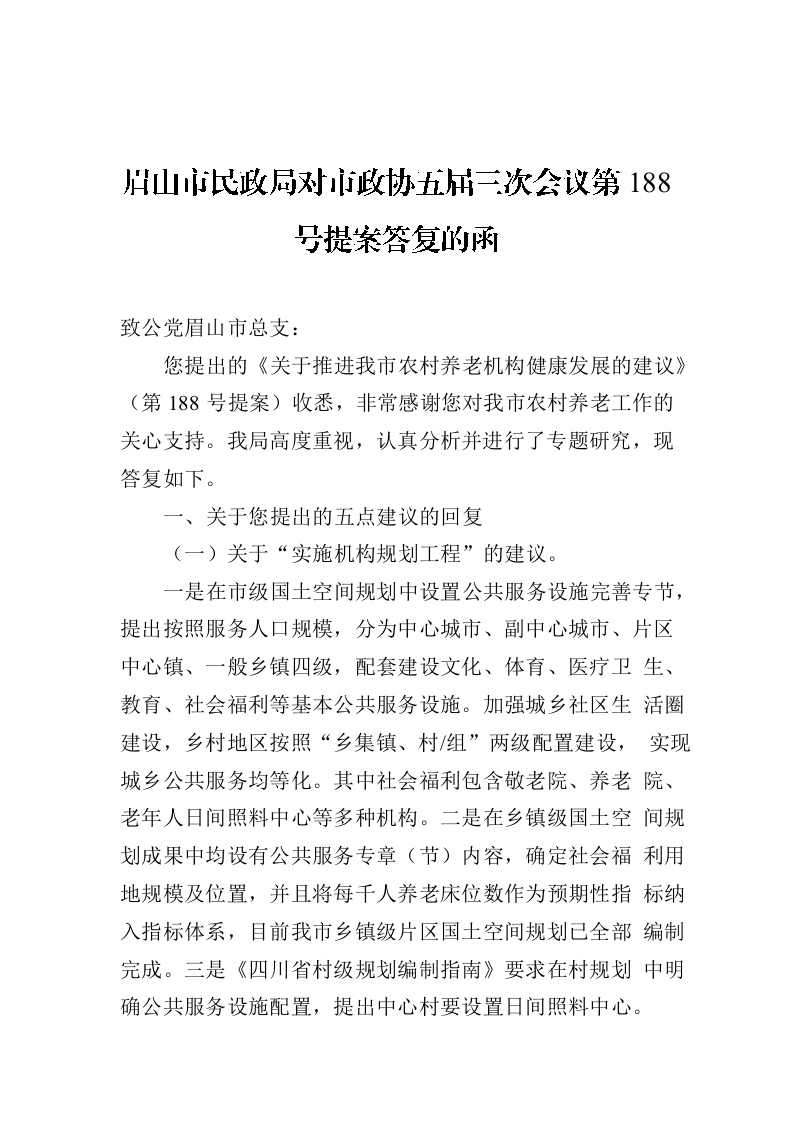 / 眉山市民政局对市政协五届三次会议第188号提案答复的函