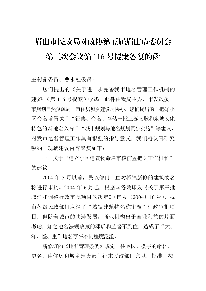 / 眉山市民政局对政协第五届眉山市委员会第三次会议第116号提案答复的函