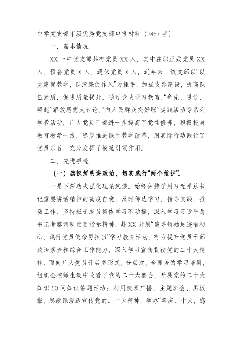 / 中学学校党支部市级优秀党支部申报材料