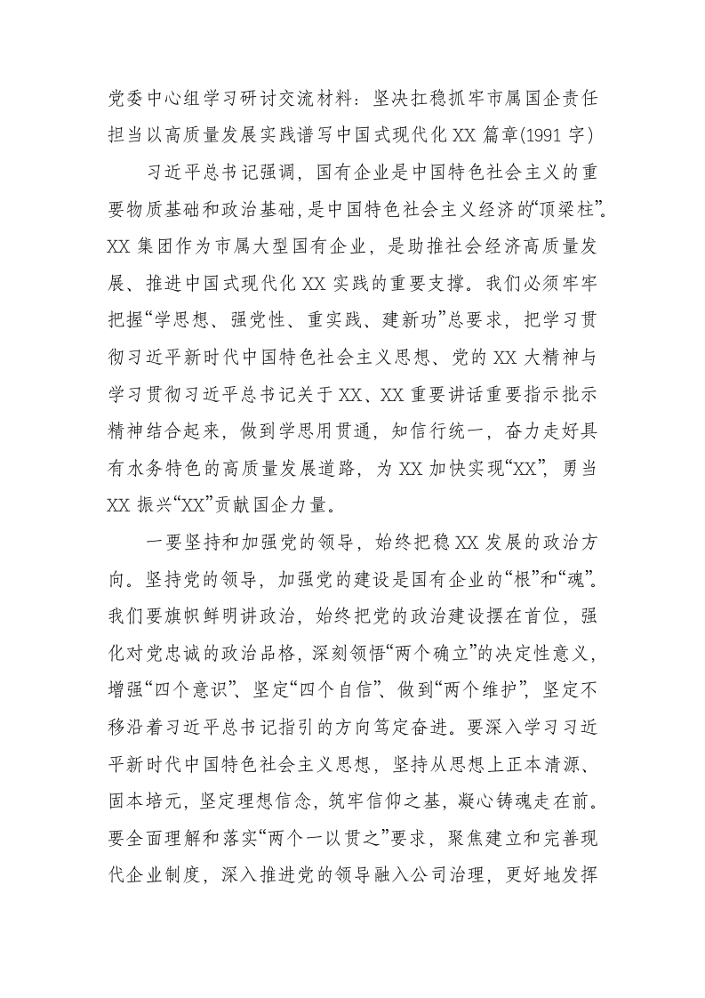 / 党委中心组学习研讨交流材料:坚决扛稳抓牢市属国企责任担当以高质量发展实践谱写中国式现代化XX篇章