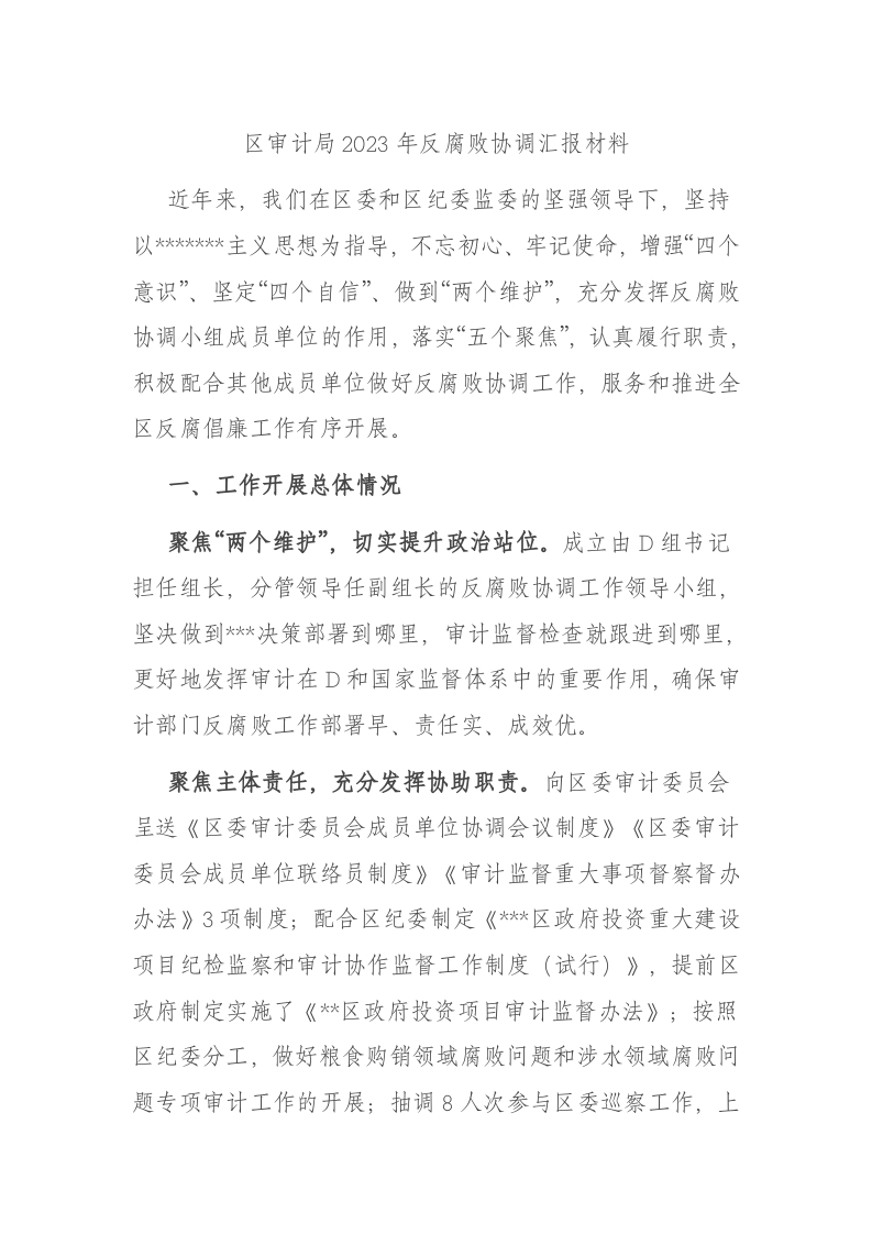 / 区审计局2023年反腐败协调汇报材料