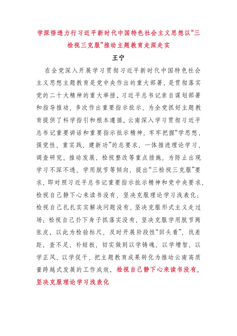 / 学深悟透力行习近平新时代中国特色社会主义思想以“三检视三克服”推动主题教育走深走实