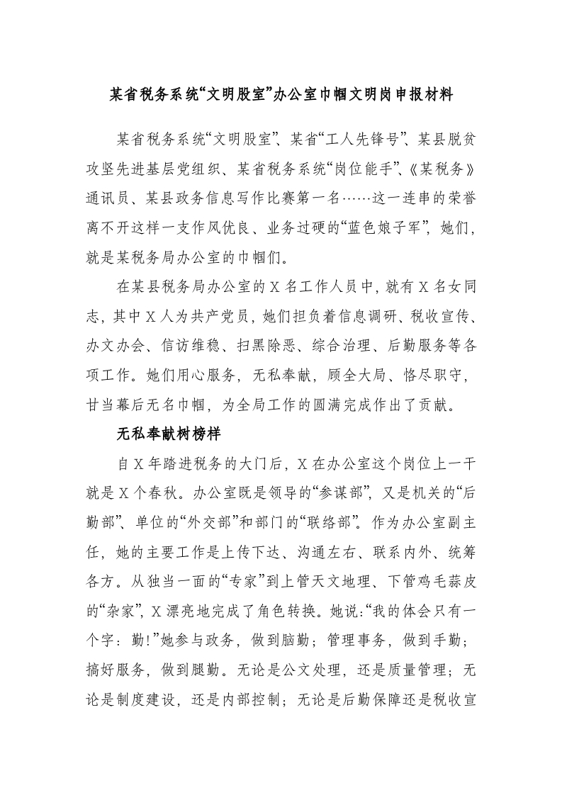 / 省税务系统“文明股室”办公室巾帼文明岗申报材料