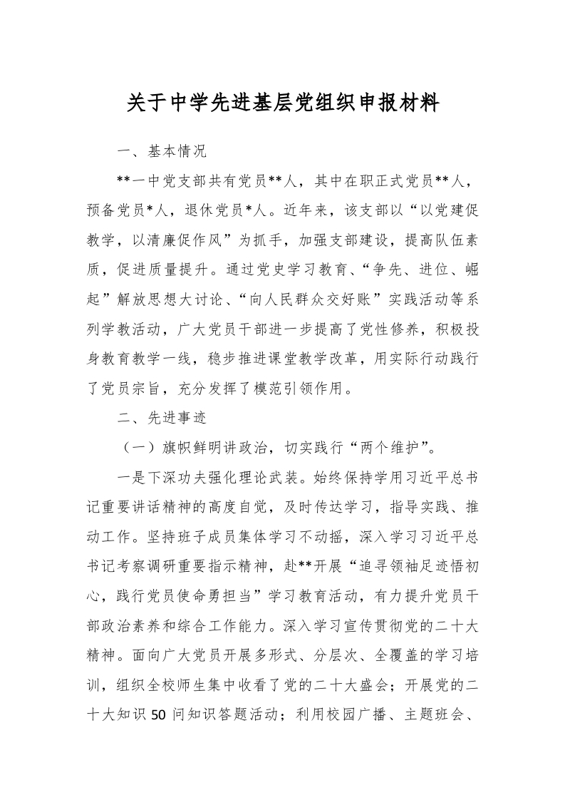/ 关于中学先进基层党组织申报材料