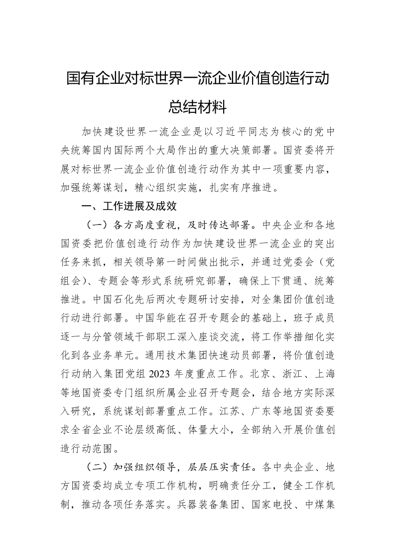 / 国有企业对标世界一流企业价值创造行动总结材料