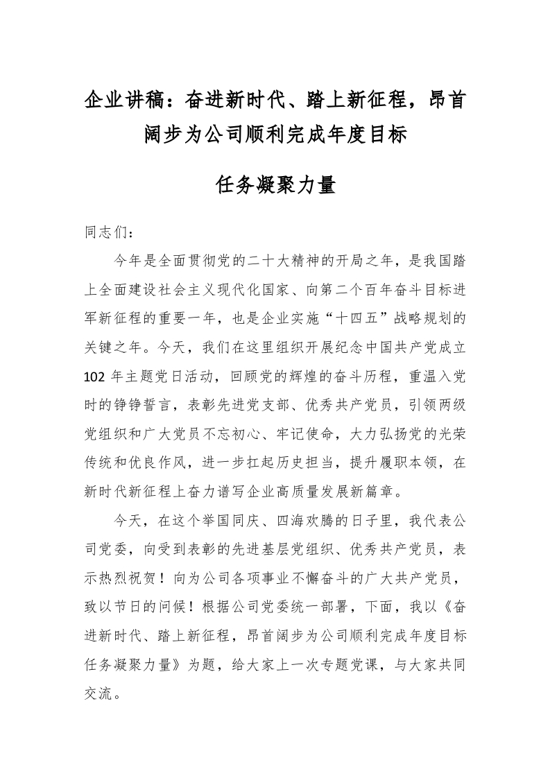 / 企业讲稿:奋进新时代、踏上新征程,昂首阔步为公司顺利完成年度目标任务凝聚力量