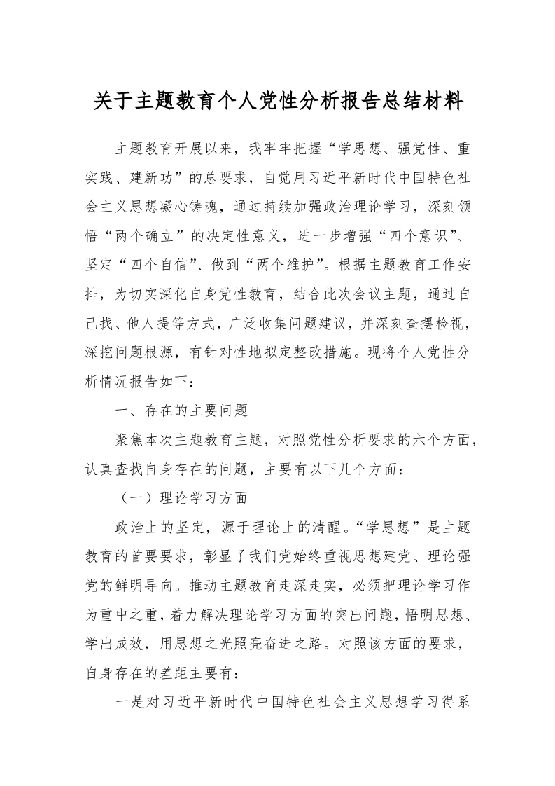 关于主题教育个人党性分析报告总结材料