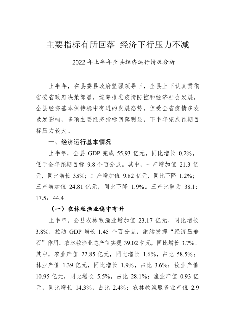 / 主要指标有所回落 经济下行压力不减——2022年上半年全县经济运行情况分析