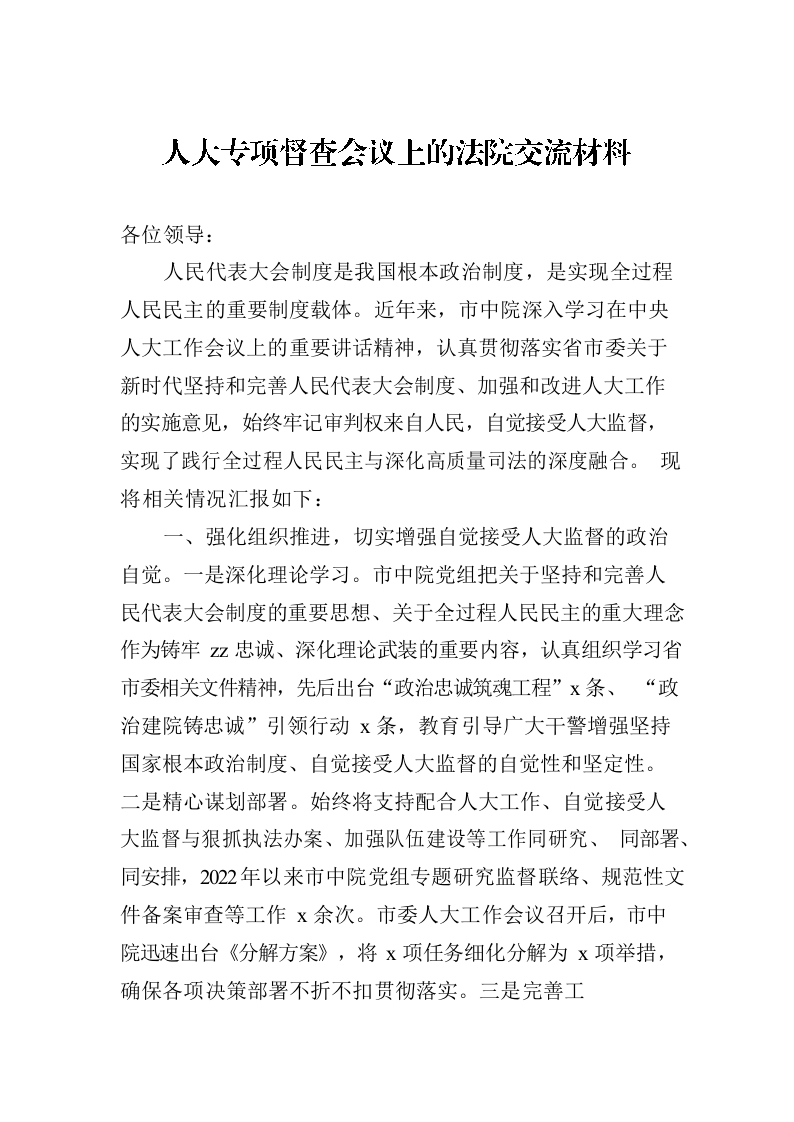 / 人大专项督查会议上的法院交流材料