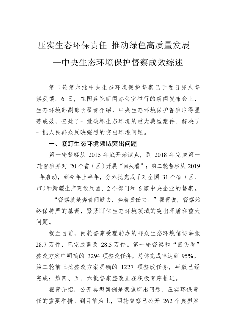 / 压实生态环保责任 推动绿色高质量发展——中央生态环境保护督察成效综述