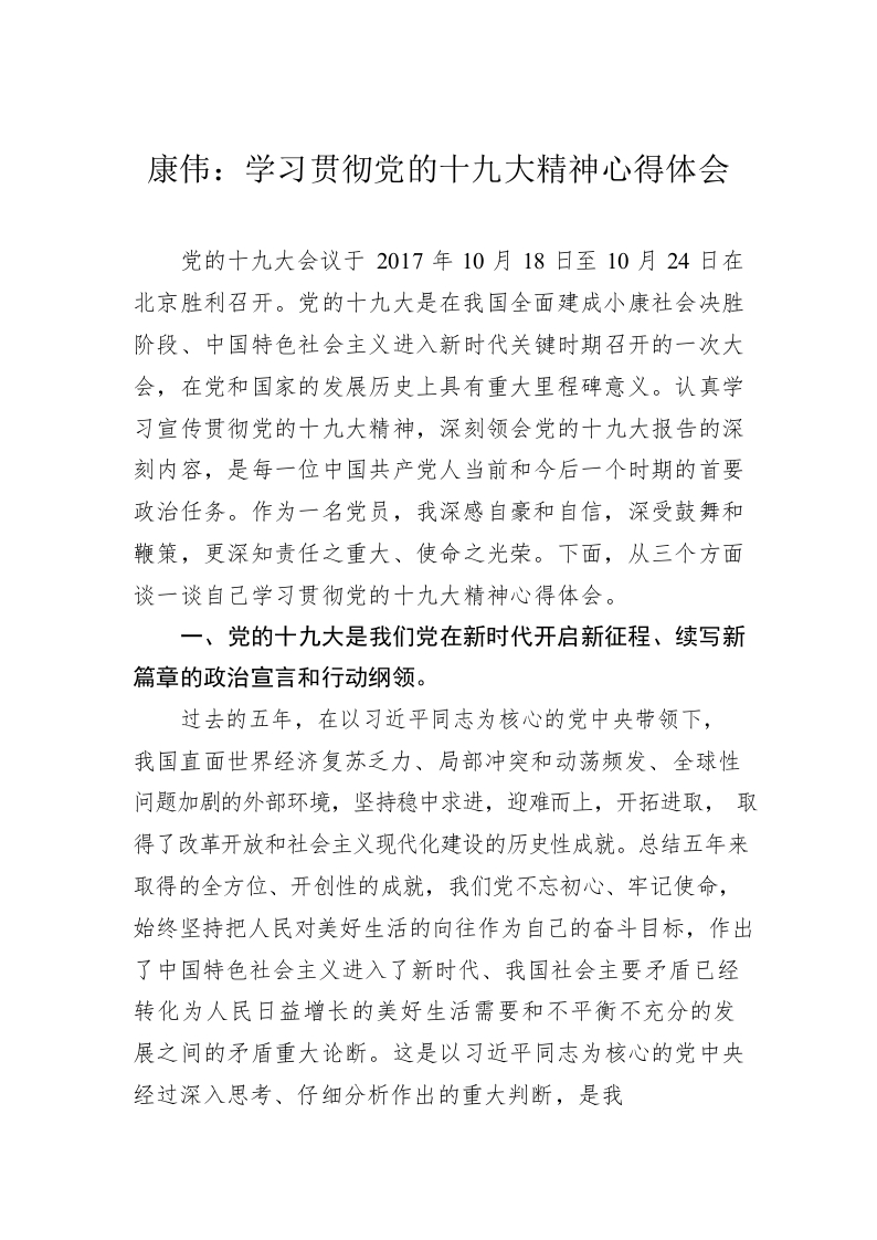 / 康伟:学习贯彻党的十九大精神心得体会