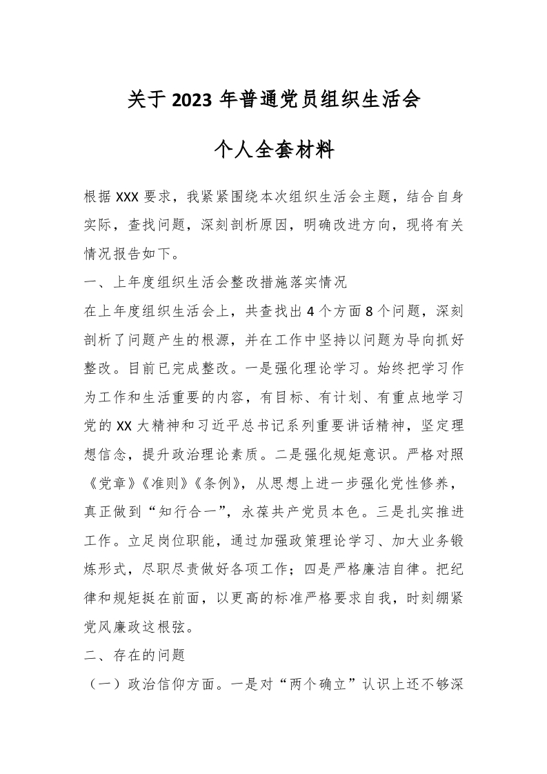 / 关于2023年普通党员组织生活会个人全套材料